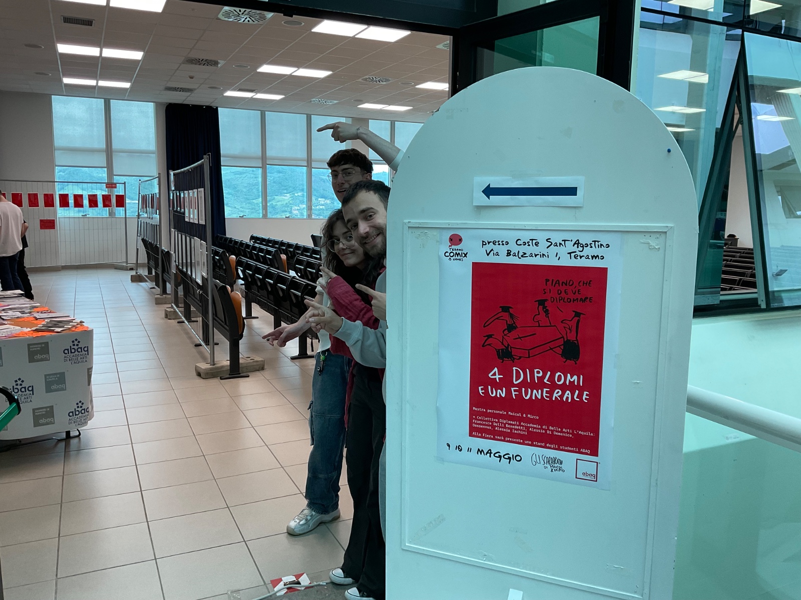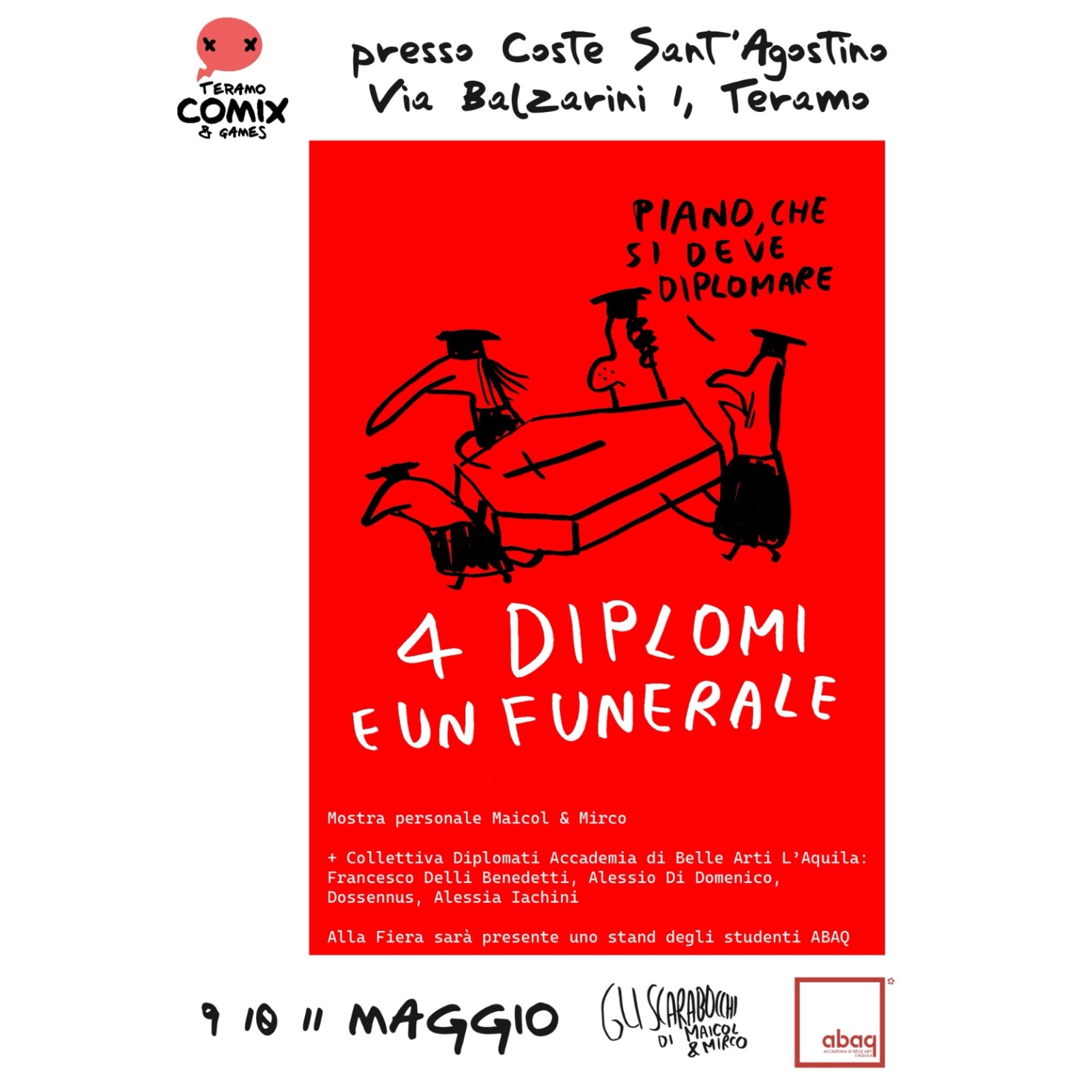 In occasione di Teramo Comix & Games (9–11 maggio 2025), la Scuola di Grafica dell’Accademia di Belle Arti dell’Aquila ha presentato la mostra “4 diplomi e un funerale”, curata da Maicol & Mirco (Michael Rocchetti), docente di Arte del Fumetto e referente dell’indirizzo dedicato al fumetto presso l’ABAQ.