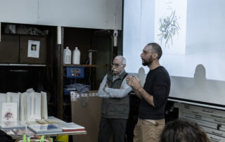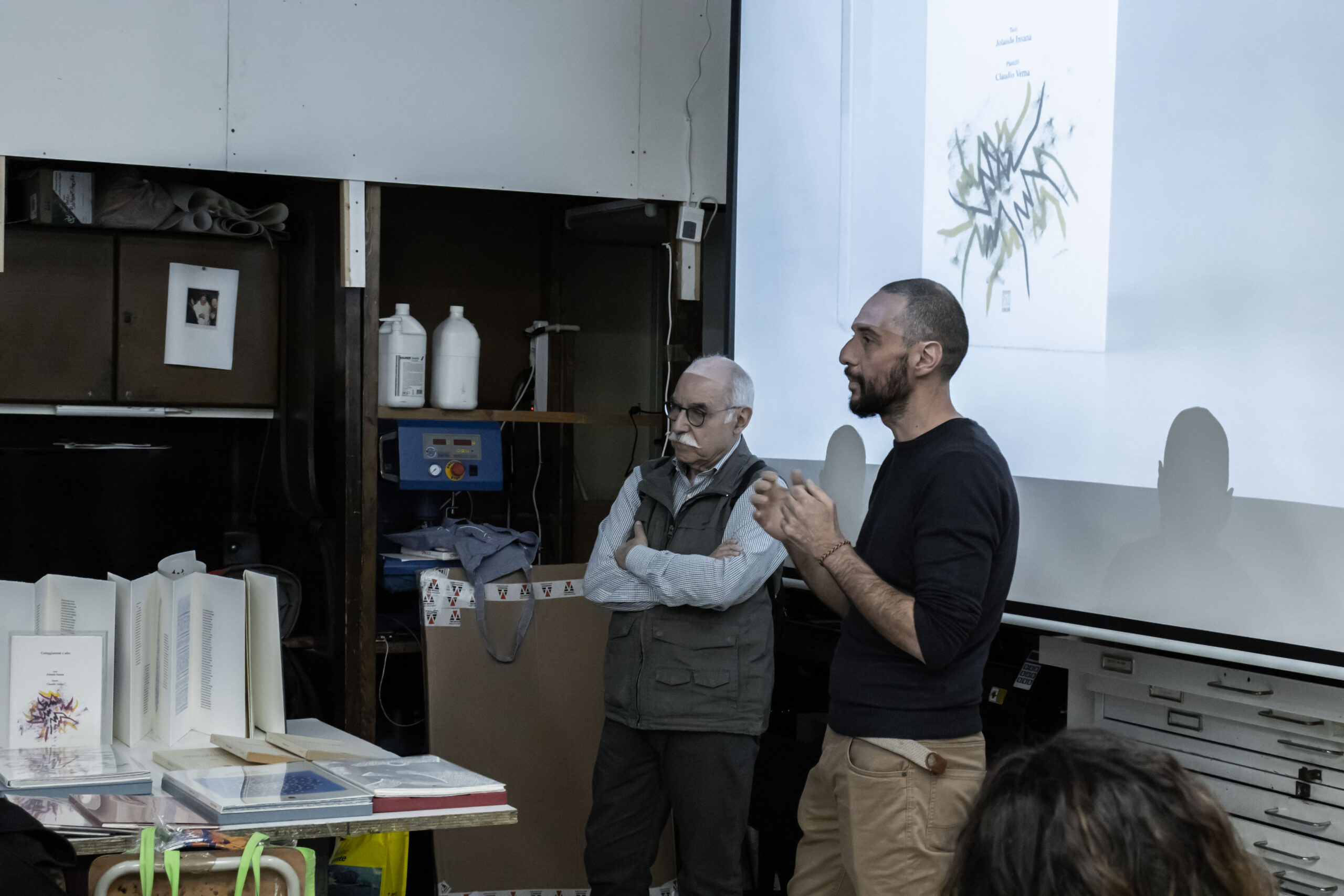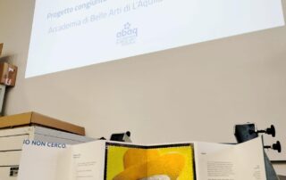 Nella mostra “Libri d’arte” sono state esposte, oltre ad alcune pubblicazioni degli anni passati, le opere delle studentesse e degli studenti della Scuola di Grafica, coordinati dal prof. Gianluigi Bellucci con il supporto dei docenti Carlo Nannicola e Daniel Tummolillo. Le opere, raccolte in un prezioso libro d’artista in edizione limitata, sono realizzate dalle studentesse e dagli studenti che hanno frequentato i corsi di Grafica d’arte e di Editoria d’Arte del prof. Gianluigi Bellucci durante l’anno accademico 2023-24. Le allieve e gli allievi partecipanti sono: Laura Cataldi, Emanuele Censi, Maira Alejandra Cialone, Mara Ciuffetelli, Vincenzo Damiano Cristallo, Valentina Diletti, Greta Di Naccio, Valentina Equizi, Maria Vittoria Gentile, Giulia Landonio, Asia Lauri, Caterina Pio, Leila Richter e Manuela Valloscuro.